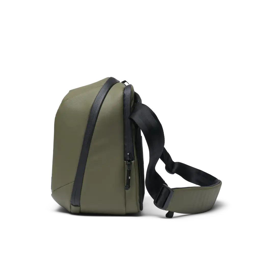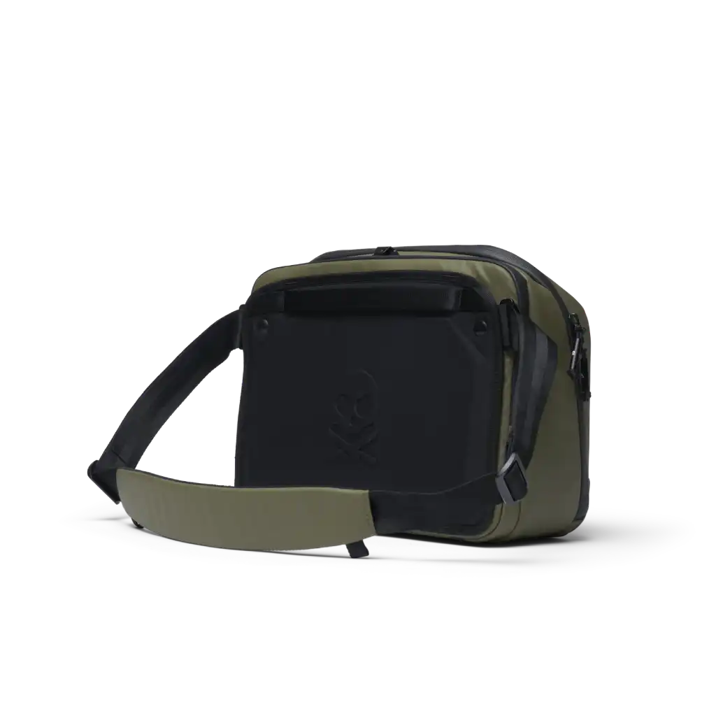 This camera messenger bag was designed for maximum comfort and features a padded shoulder strap that pivots so you can carry how you want it, whether that’s as a shoulder bag, cross body, or like a sling. The back of the sling has an EVA foam formed back panel and we’ve included a roller luggage pass-thru to give your shoulder a rest while traveling. On the front and bottom of the sling, there are external molle straps if you need to carry a tripod or jacket (strap sold separately). The dedicated laptop compartment can fit up to a 14” laptop.